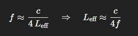 f≈c4 Leff⇒Leff≈c4ff \approx \frac{c}{4\,L_{\text{eff}}} \quad\Rightarrow\quad L_{\text{eff}} \approx \frac{c}{4f}